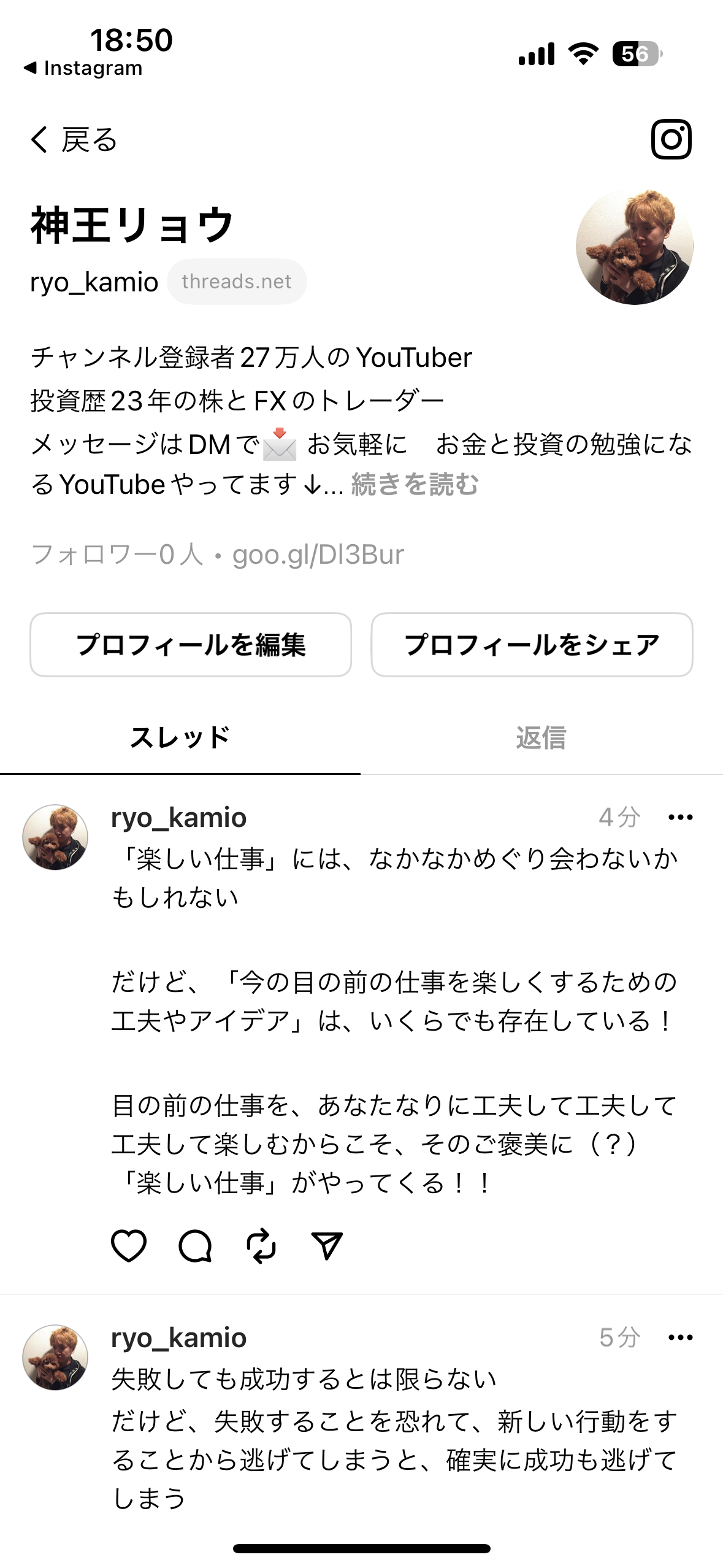 流れに乗って、神王リョウのインスタの「threads」(スレッズ)を始めました